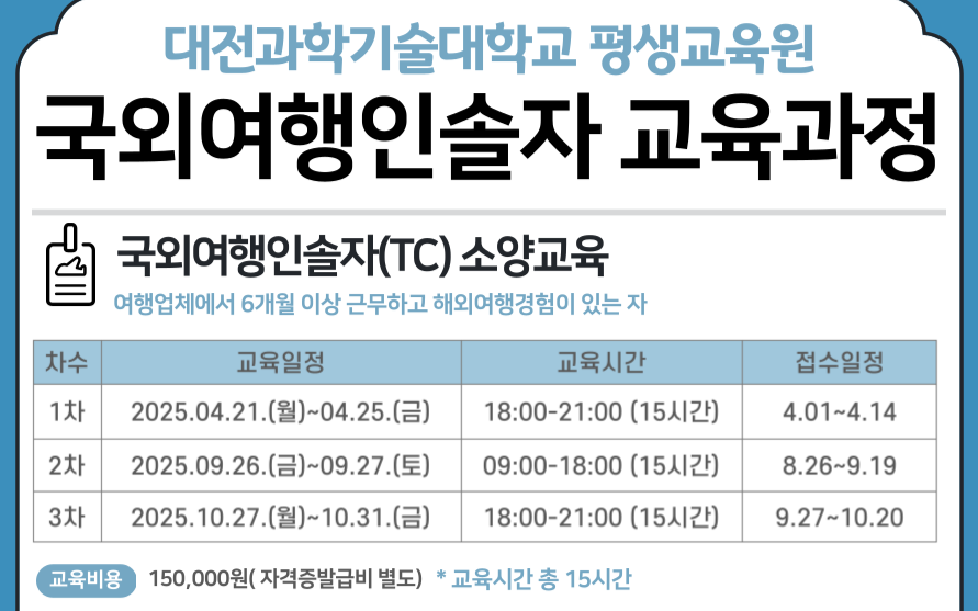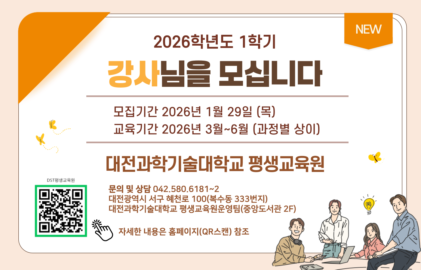 정지 재생 소통하는 DSTsns 유튜브 인스타그램 블로그 팝업존 아이콘배너1 전체교육과정(수강신청) 교육과정 소개 모집포스터Photo Gallery전체교육과정 메뉴를 참고하세요 더보기 연락처 및 이용시간 평생교육원 운영시간 안내입니다. 문의 T. 042-580-6181 운영시간 월~금 09:00 ~18:00 (주말,공휴일제외) 아이콘배너2 교육과정 안내 수강안내 등록안내 오시는길 DST 소식 새로운 소식을 만나보실 수 있습니다. 공지사항 더보기 자료실(서식) 더보기 질의 및 응답 더보기