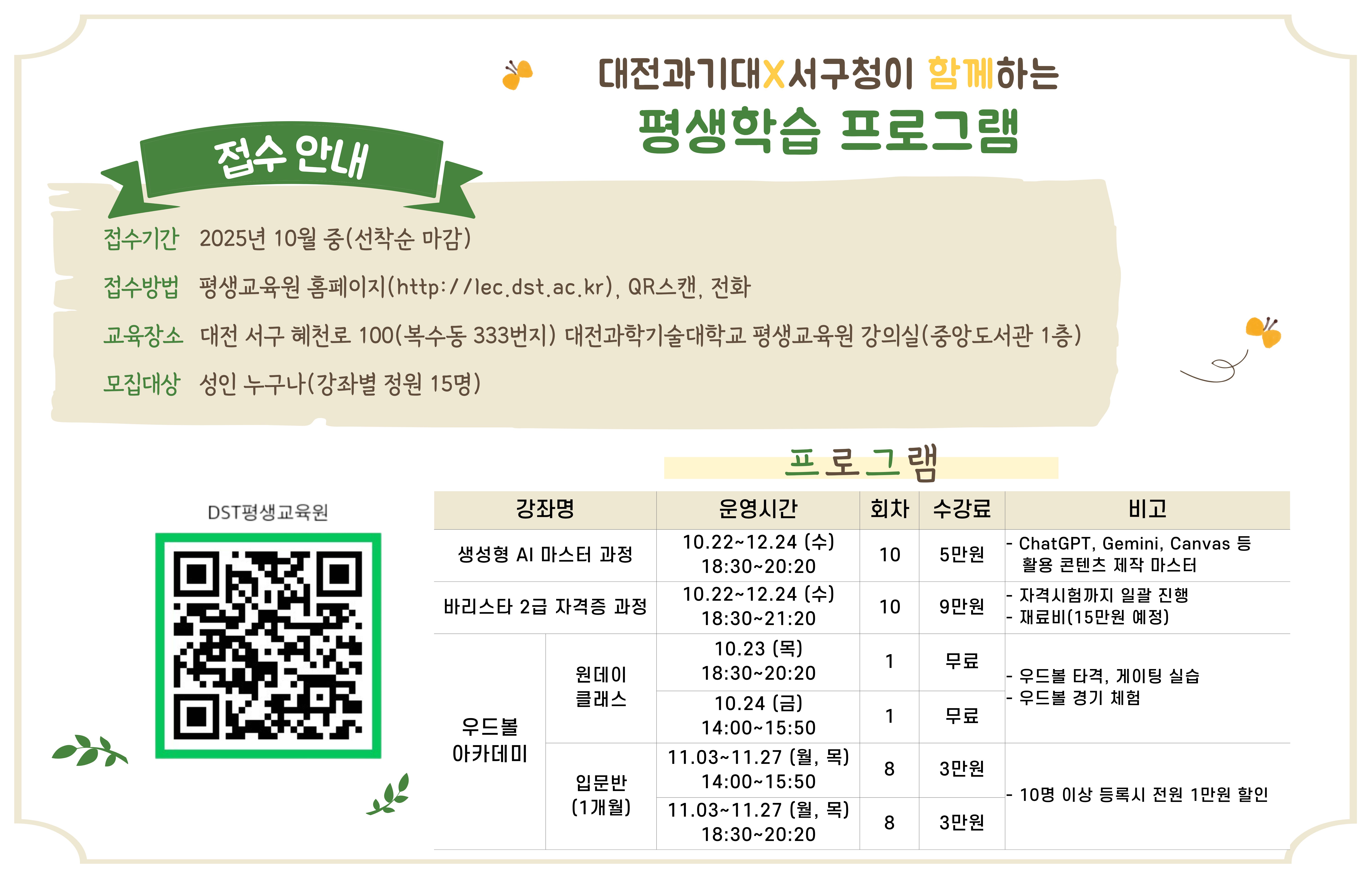 정지 재생 소통하는 DSTsns 유튜브 인스타그램 블로그 팝업존 아이콘배너1 전체교육과정(수강신청) 교육과정 소개 모집포스터Photo Gallery전체교육과정 메뉴를 참고하세요 더보기 연락처 및 이용시간 평생교육원 운영시간 안내입니다. 문의 T. 042-580-6181 운영시간 월~금 09:00 ~18:00 (주말,공휴일제외) 아이콘배너2 교육과정 안내 수강안내 등록안내 오시는길 DST 소식 새로운 소식을 만나보실 수 있습니다. 공지사항 더보기 자료실(서식) 더보기 질의 및 응답 더보기